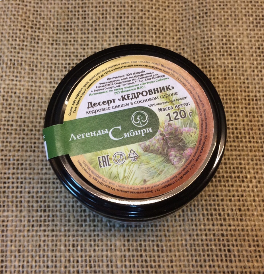 Состав: ядро кедрового ореха, сироп (молодые сосновые шишки, вода питьевая, сахар).