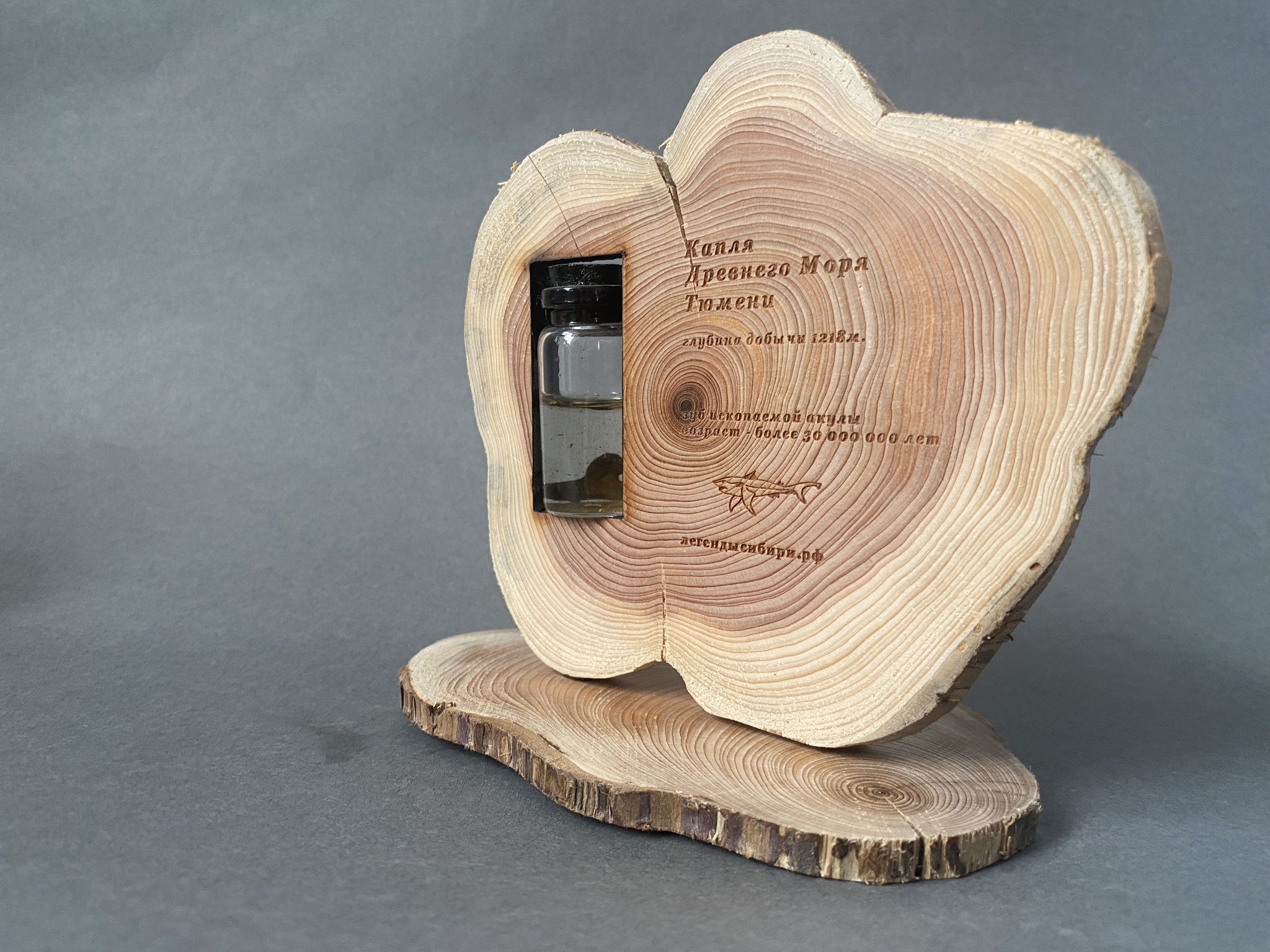 Новый вариант нашего сувенира «Капля древнего моря Тюмени». Теперь из можжевельника. Внутри флакончика - вода из термального источника «СоветSky” и настоящий зуб ископаемой акулы, найденный в Тюменской области! Возраст - более 30 000 000 лет! Этот замечательный тюменский сувенир - уже в Галерее сувениров «Легенды Сибири». Диаметр 10-12 см.