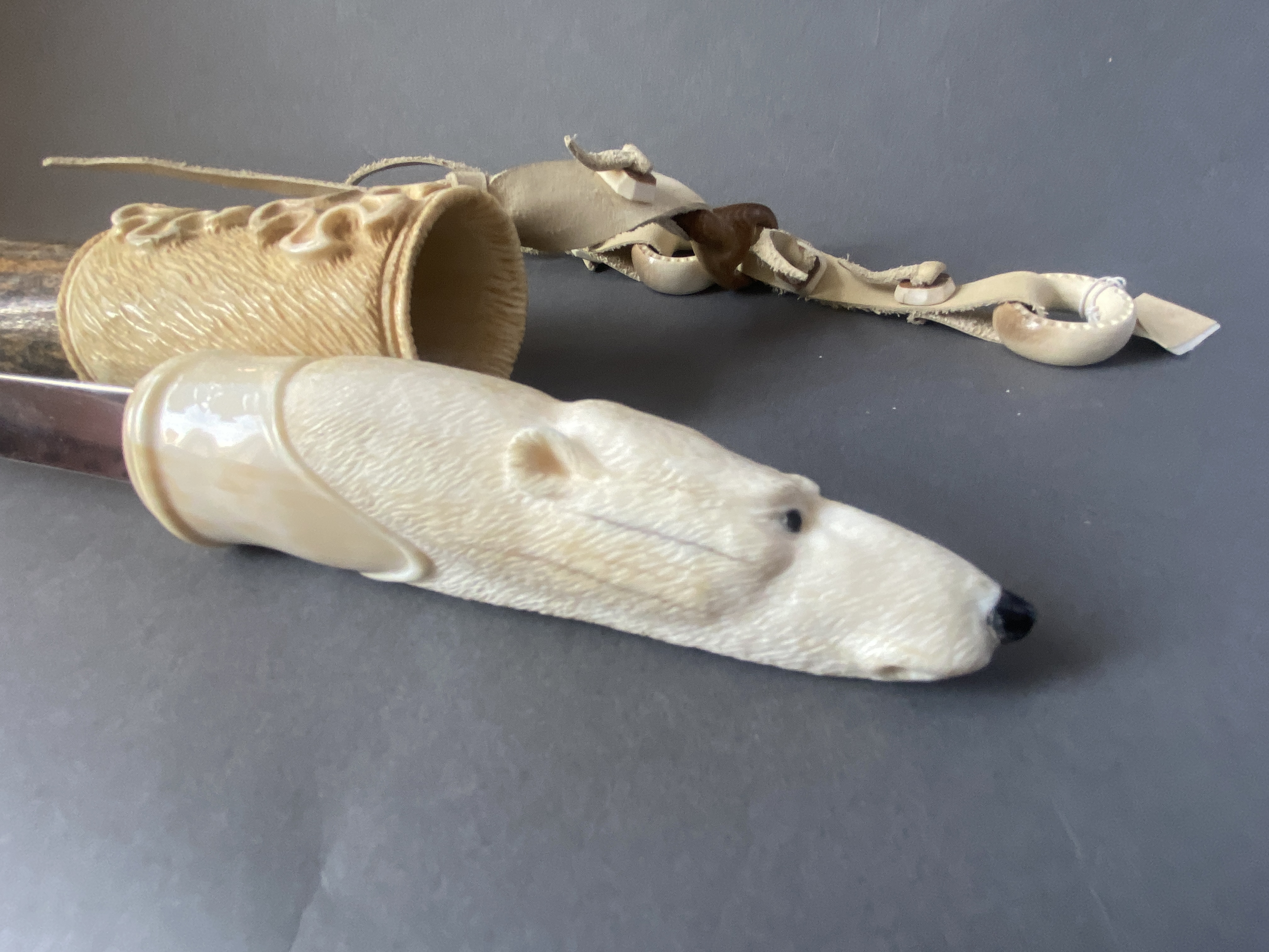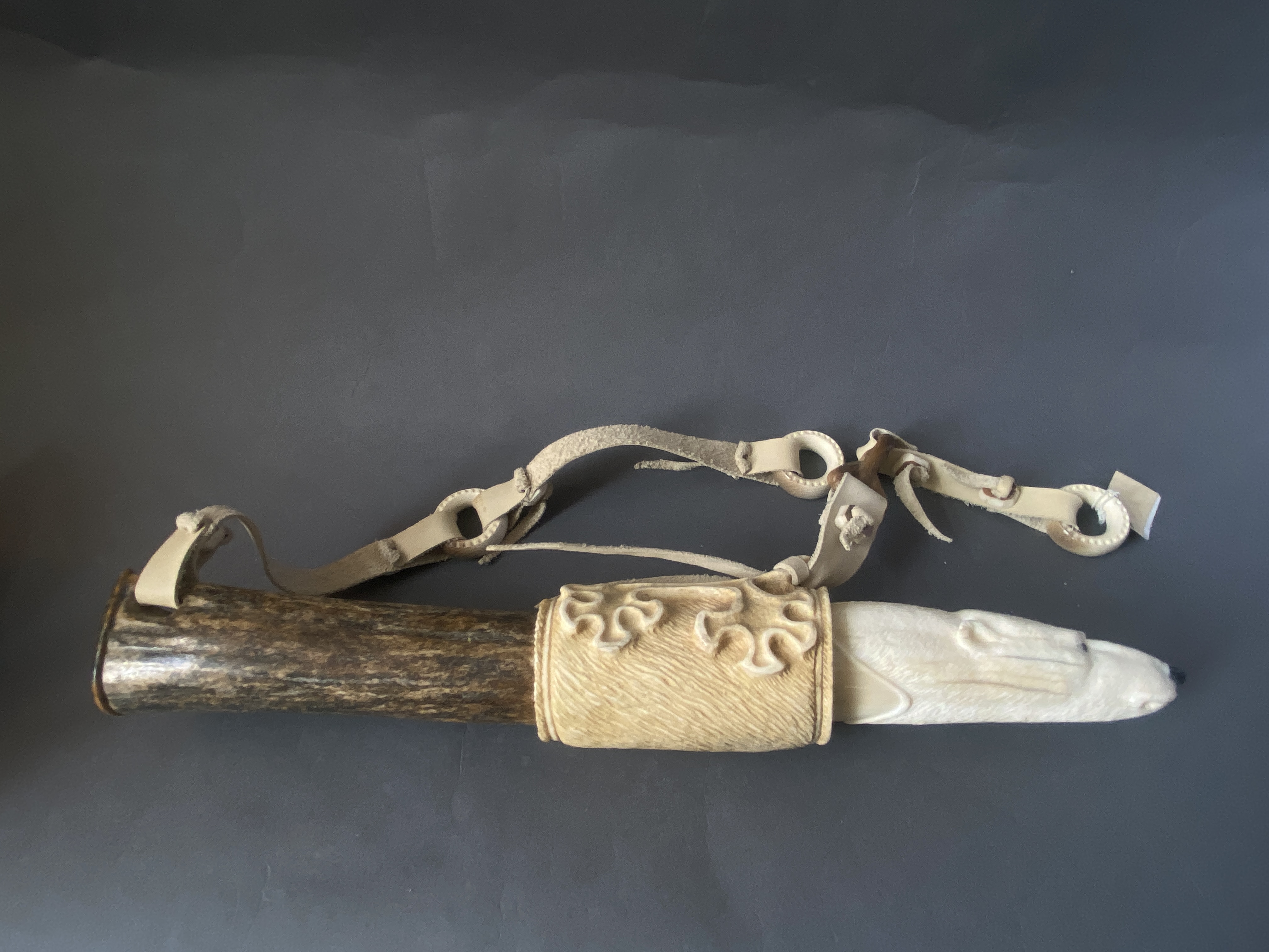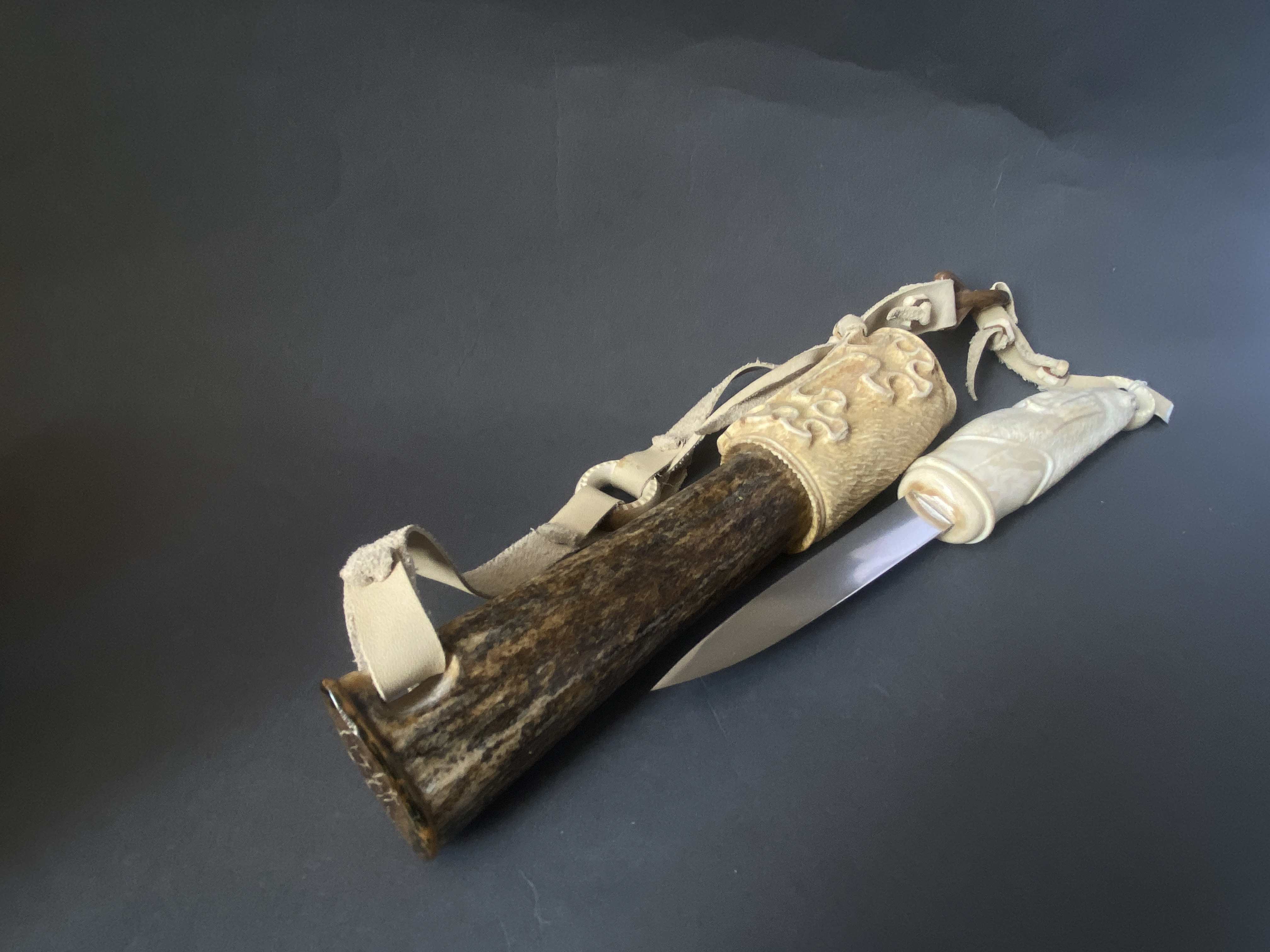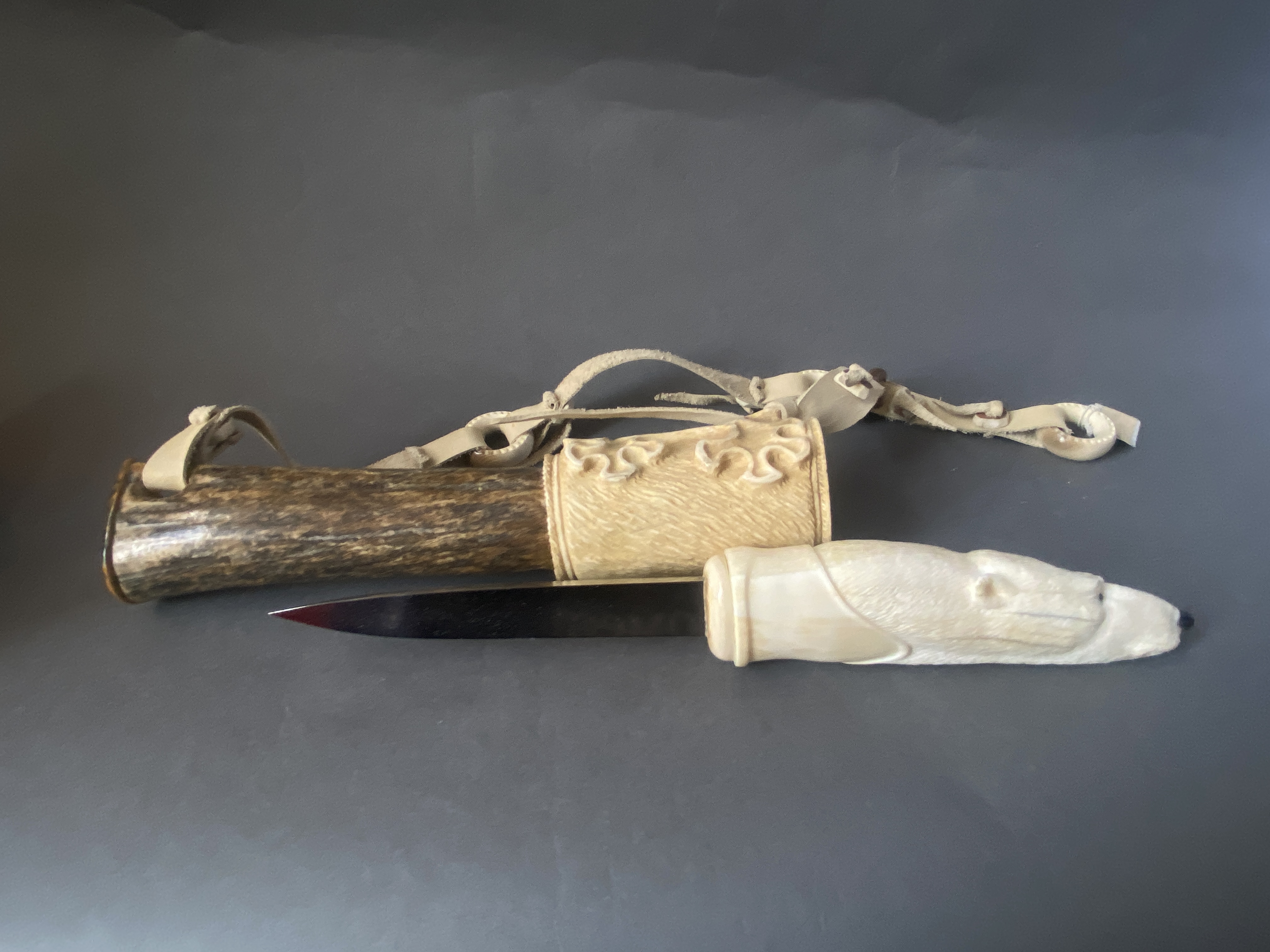 Материал; бивень мамонта, рог лося, рог оленя, кожа, сталь. Рукоятка выполнена из клыка моржа.