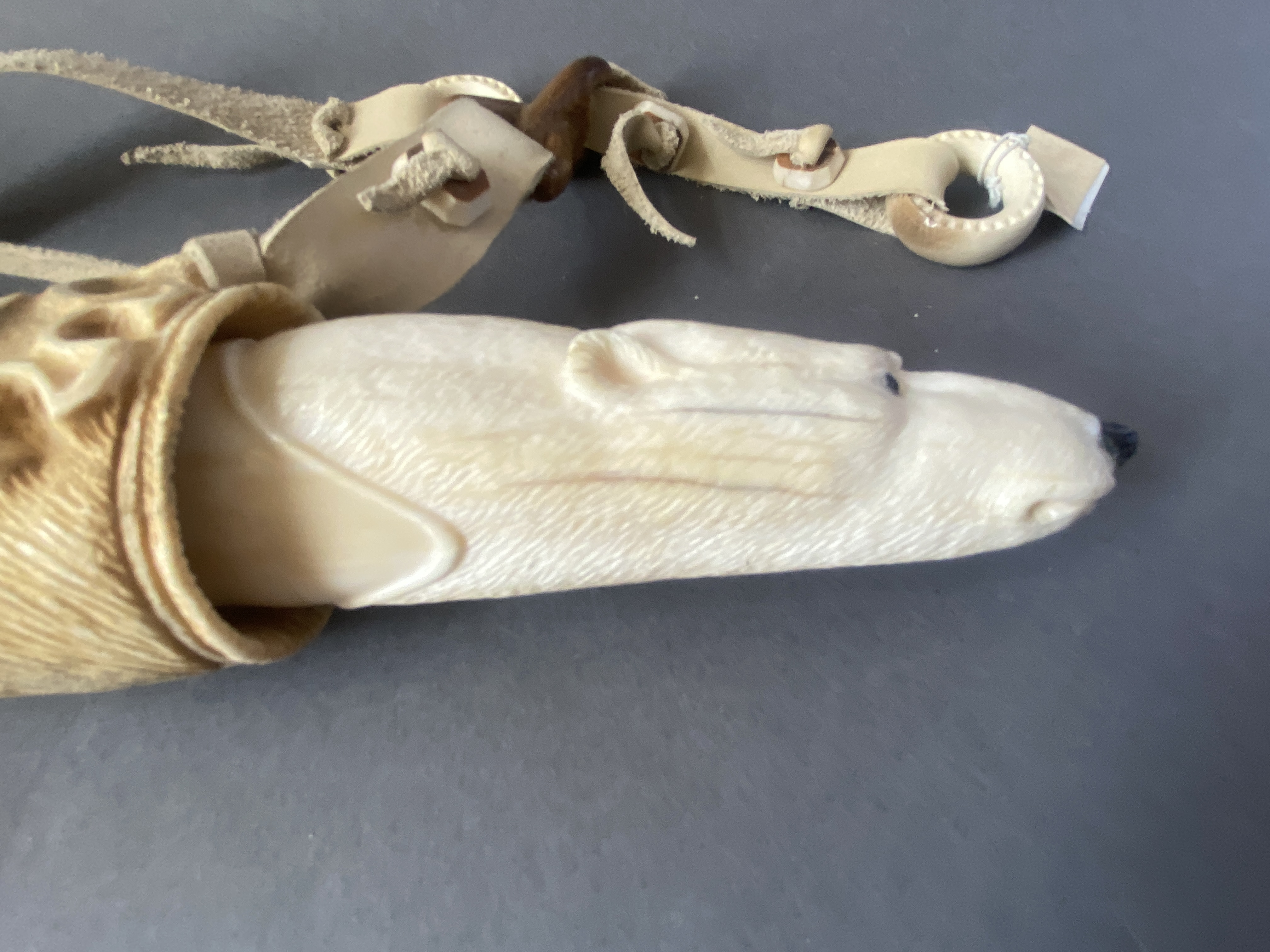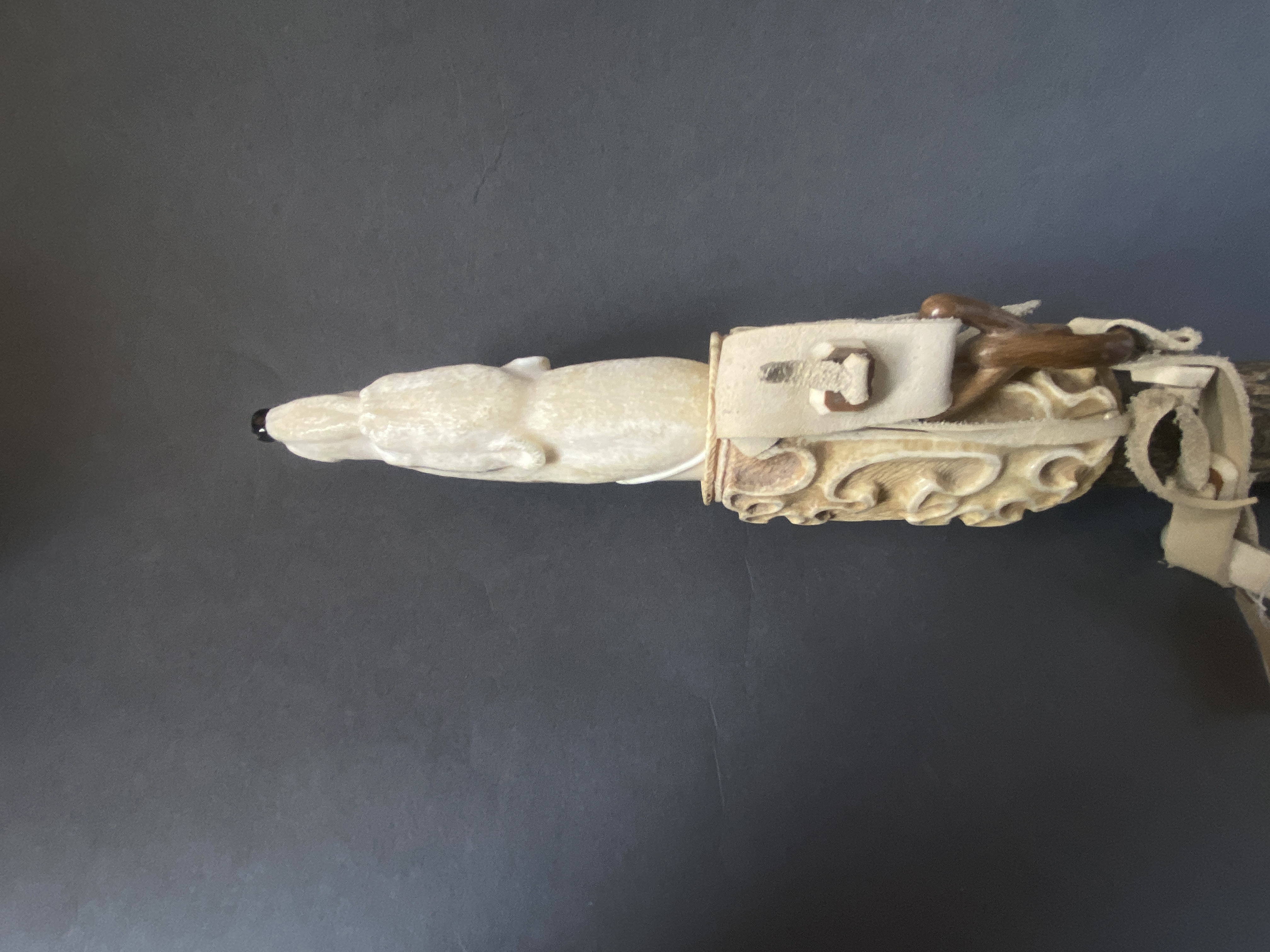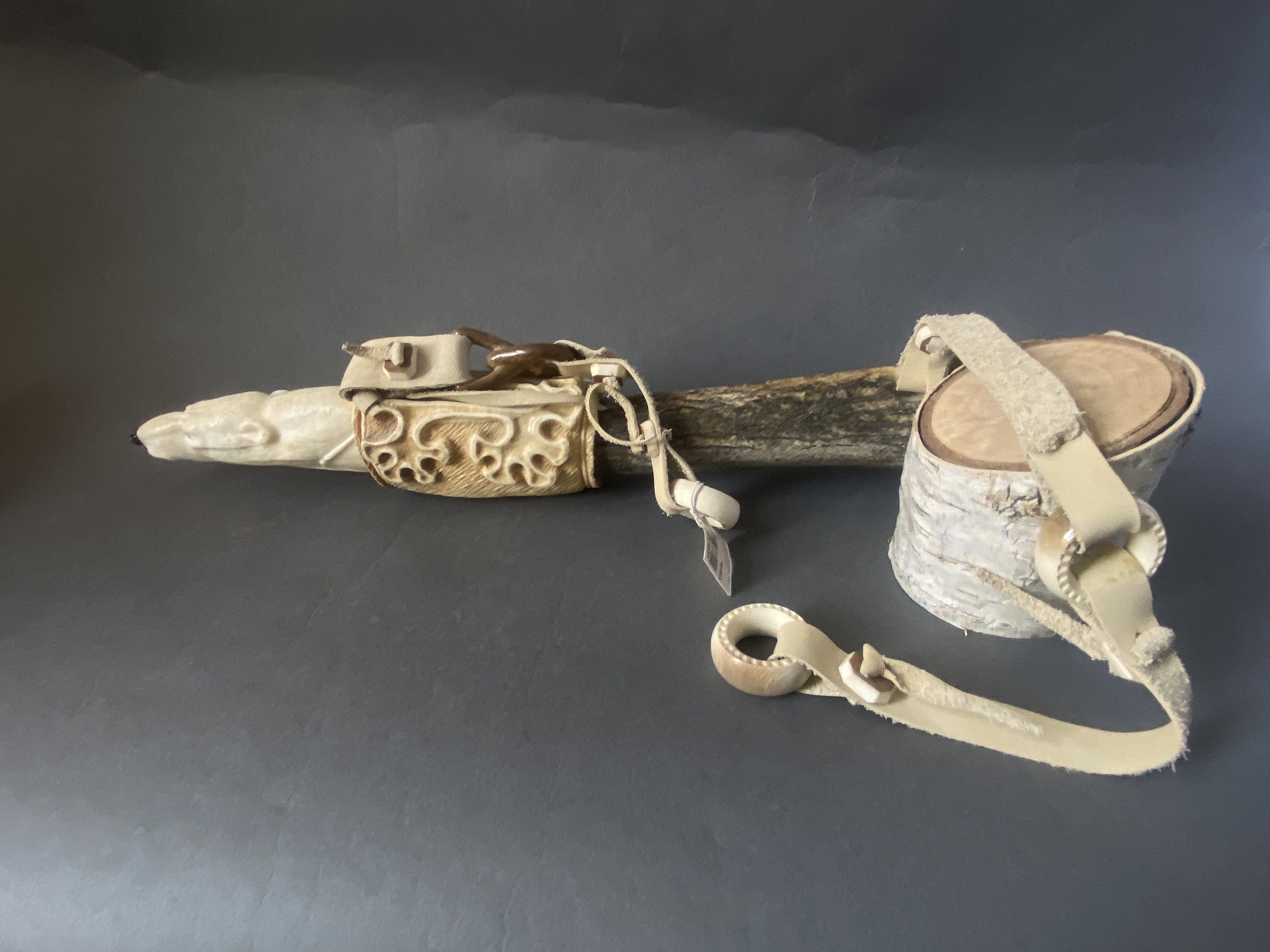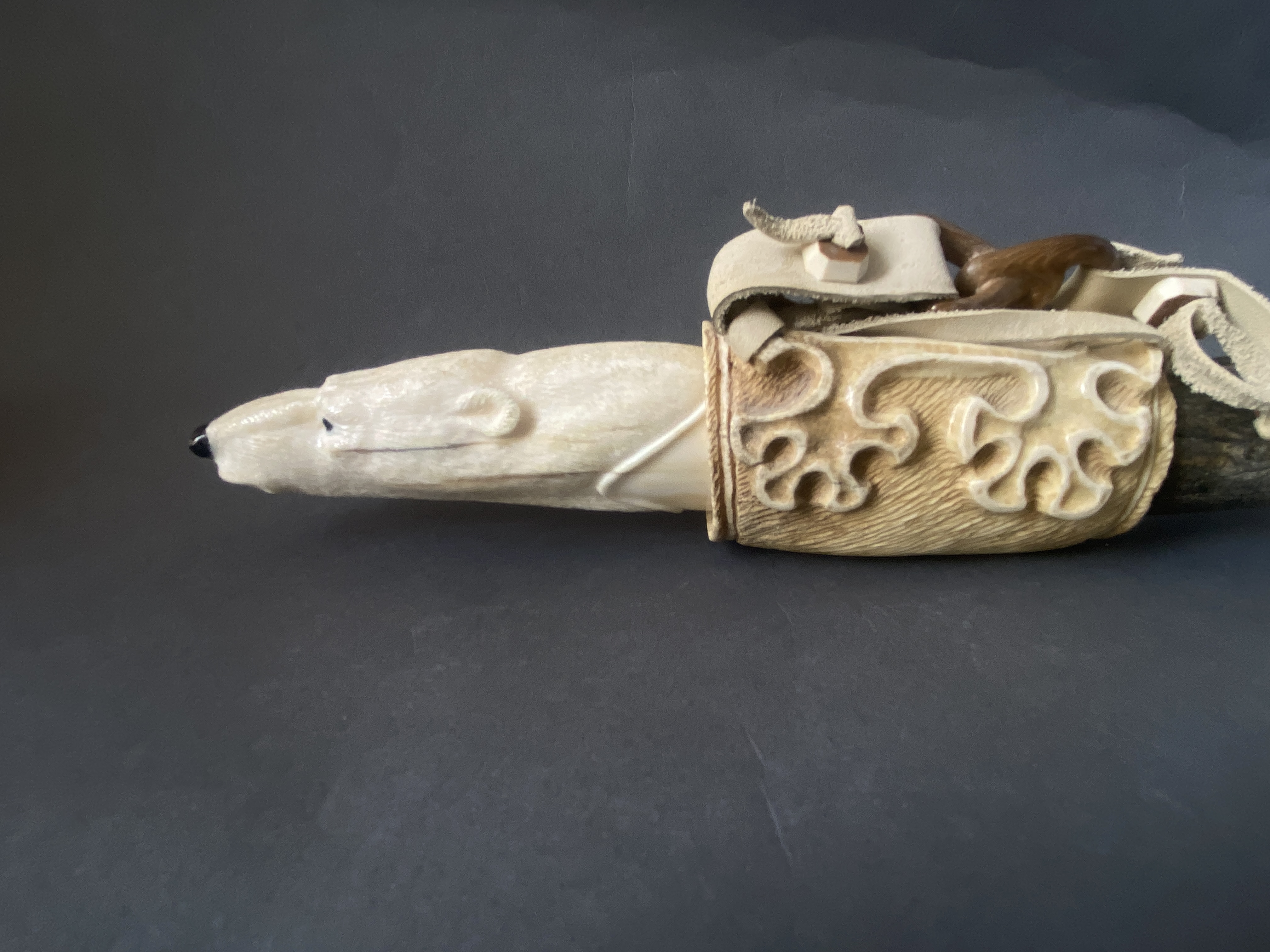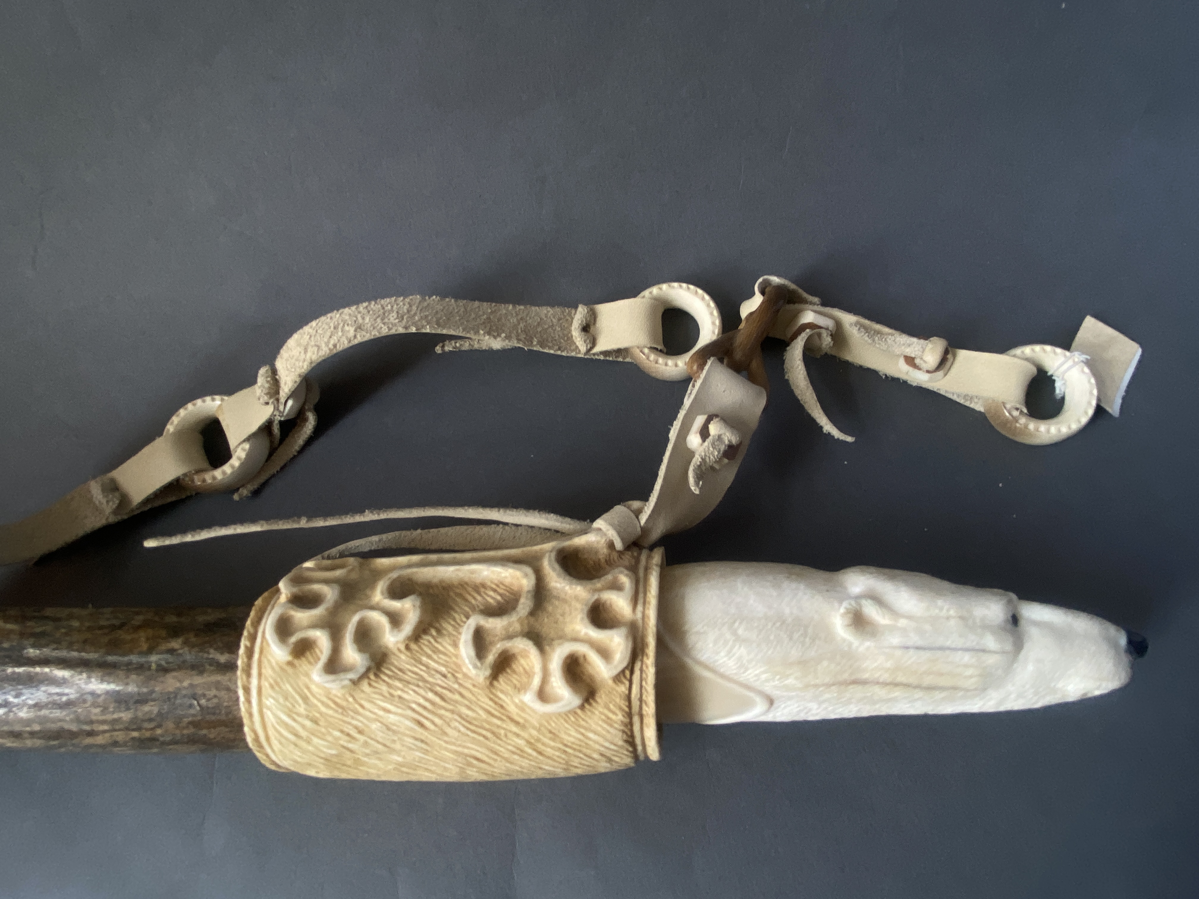 Материал; бивень мамонта, рог лося, рог оленя, кожа, сталь. Рукоятка выполнена из клыка моржа.