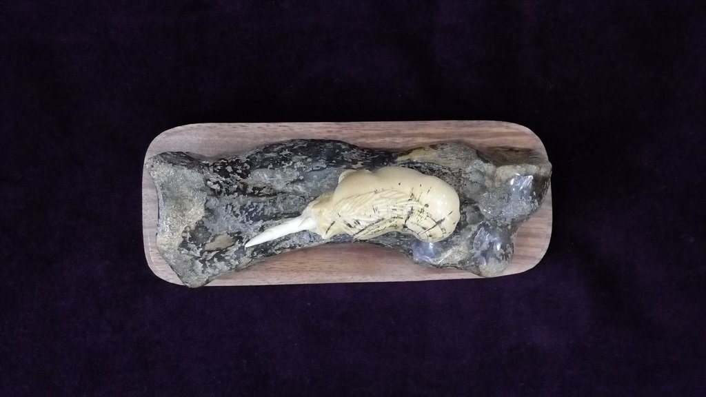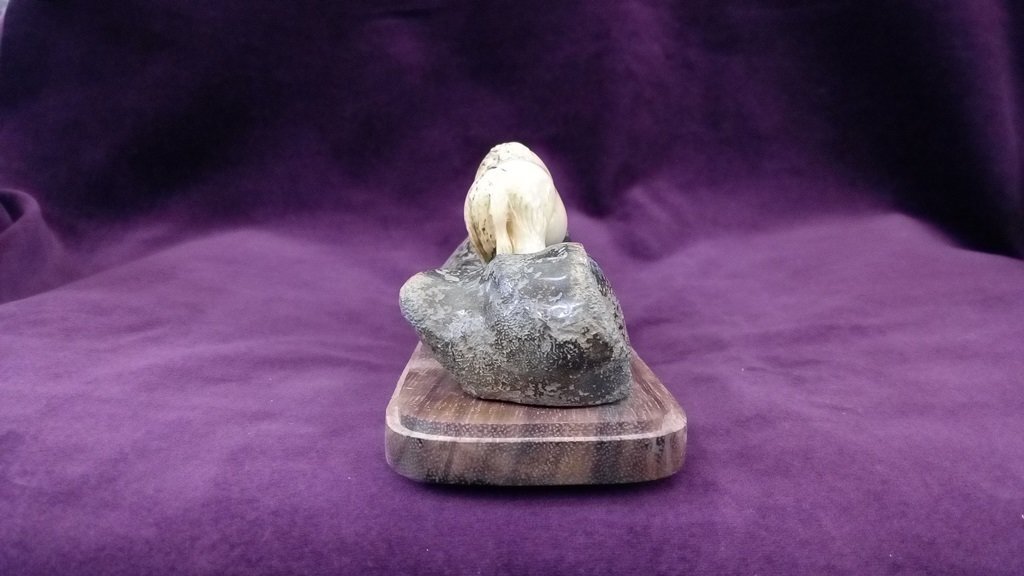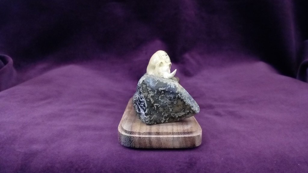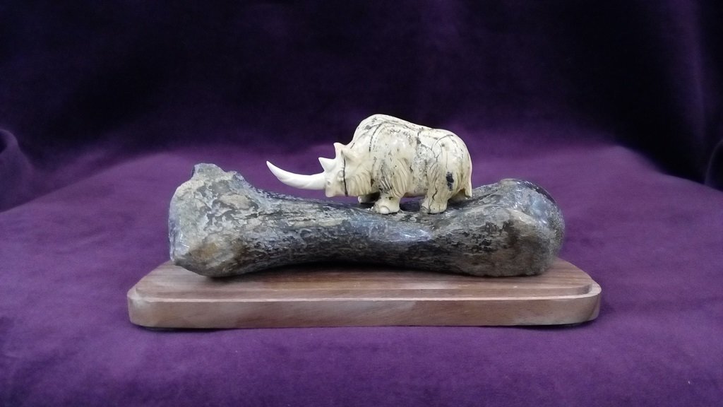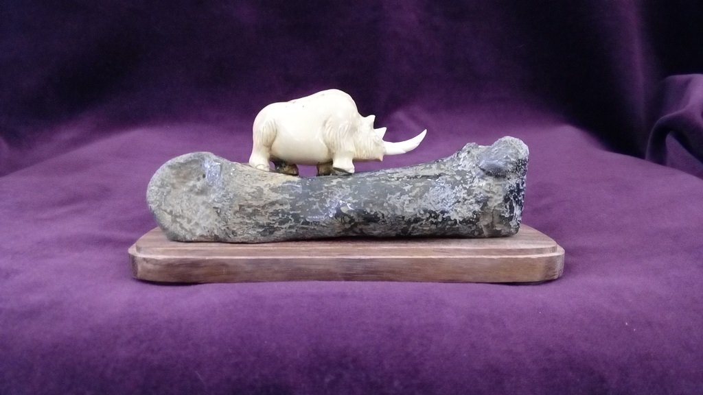 Сувенир представляет собой композицию, изображающую шерстистого носорога. Фигура древнего животного выполнена из бивня мамонта. Фрагменты бивня имеют красивый коричневатый оттенок, приобретённый в процессе минерализации в течение нескольких тысяч лет. Основа – кость мамонта. Возраст используемого материала – более 10 000 лет. Подставка – красное дерево.